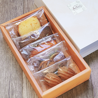 木目調のシンプルなデザイン箱にお菓子を詰めました。手土産にどうぞ!